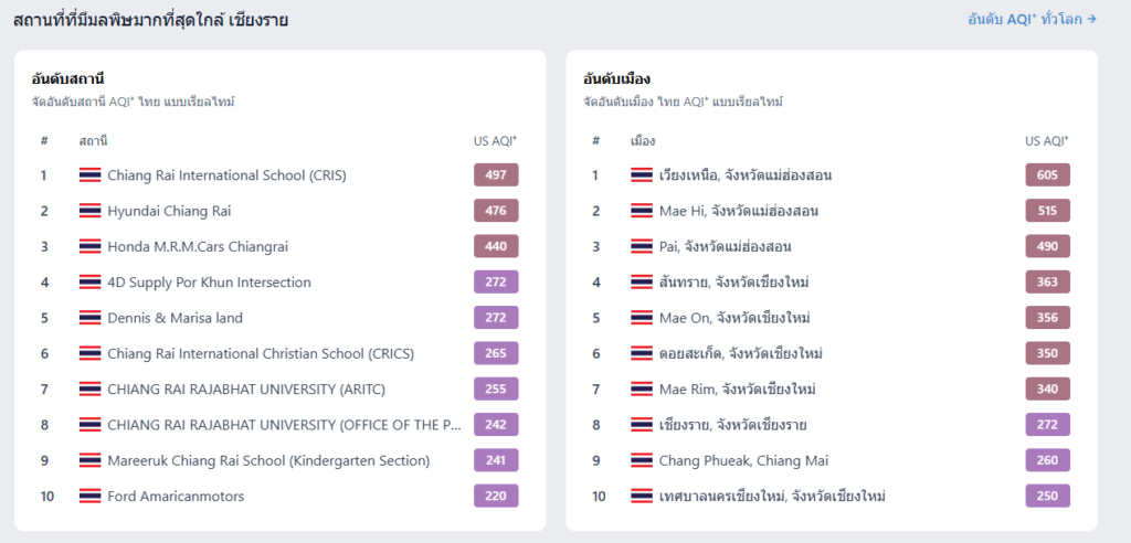 ความน่ากังวลของสถานการณ์ครั้งนี้อยู่ตรงที่ ค่าเฉลี่ยของเมืองยังไม่ใช่ตัวเลขสูงสุดที่เกิดขึ้นจริงในพื้นที่เชียงราย เพราะเมื่อดูในระดับจุดตรวจใกล้เคียง ข้อมูลของ IQAir พบว่าสถานีบางแห่งพุ่งขึ้นไปแตะระดับเกือบอันตรายขั้นสูงสุด โดย Chiang Rai International School อยู่ที่ 497, Hyundai Chiang Rai อยู่ที่ 476 และ Honda M.R.M.Cars Chiangrai อยู่ที่ 440 ส่วน 4D Supply Por Khun Intersection และ Dennis & Marisa land อยู่ที่ 272 เท่ากับค่าเฉลี่ยเมืองในช่วงเวลานั้นพอดี
