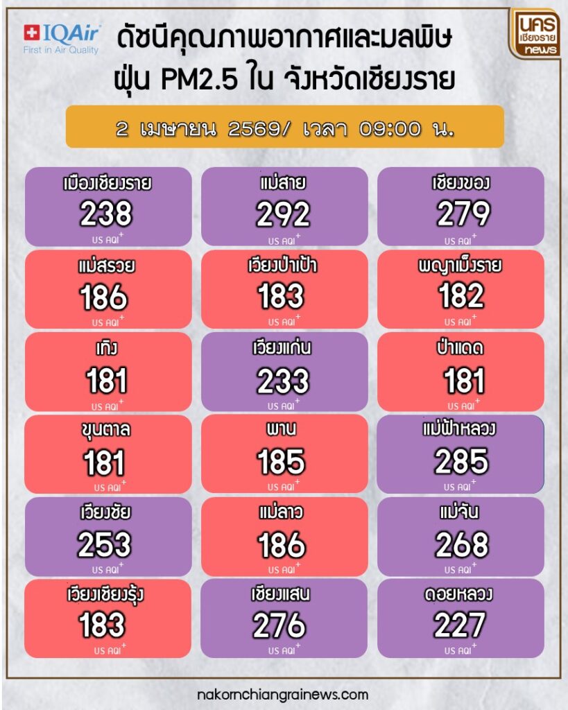 รายงานภาคสนามในเชียงรายวันที่ 2 เมษายน 2569 ระบุว่า พื้นที่ชายแดนอย่างแม่สายและเชียงของมีค่า PM2.5 สูงกว่า 200 ไมโครกรัมต่อลูกบาศก์เมตร ขณะที่ตัวเมืองเชียงรายอยู่ที่ 171 ไมโครกรัมต่อลูกบาศก์เมตร สภาพอากาศโดยรวมเต็มไปด้วยหมอกควันหนาทึบจนทัศนวิสัยลดลงชัดเจน โดยเฉพาะในพื้นที่โล่งที่แต่เดิมสามารถมองเห็นภูมิทัศน์ได้ไกล กลับมองเห็นได้เพียงระยะใกล้เท่านั้น
