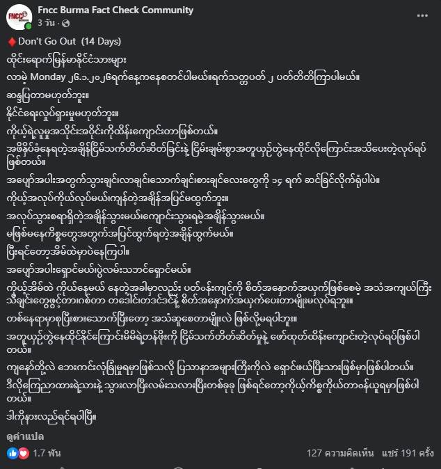 สิ่งที่ทำให้ “Don’t Go Out” กลายเป็นข่าว เพจ Fncc Burma Fact Check Community สื่อของประเทศเมียนมา โพสต์ว่า ไม่ใช่แค่คำเชิญชวนให้อยู่บ้าน แต่คือ “เหตุผล” ที่แฝงอยู่ข้างหลัง ความรู้สึกว่าบรรยากาศในชุมชนกำลังตึงขึ้น และการอยู่เงียบคือ “ทางรอดที่จับต้องได้” ในช่วงเวลาที่การตรวจเข้มและการแจ้งเบาะแสในพื้นที่ถี่ขึ้นตามที่ผู้ใช้จัดเตรียมข้อมูลไว้