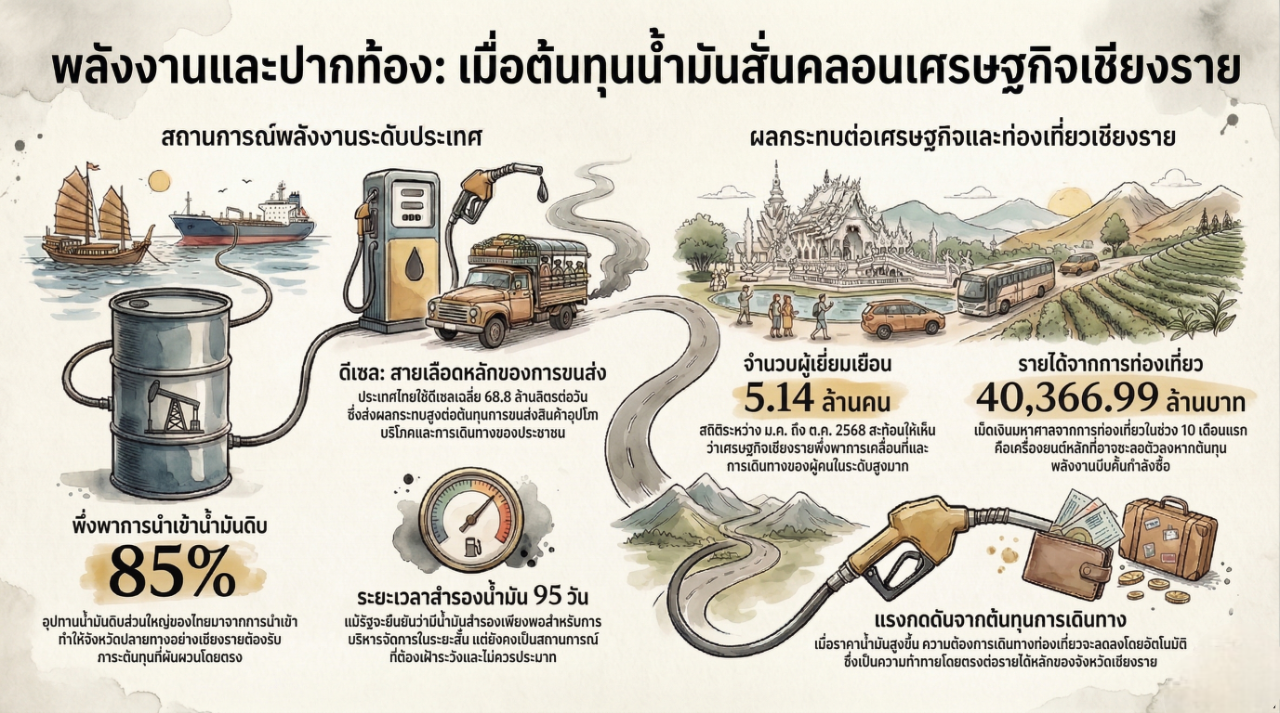 แม้เชียงรายจะอยู่ไกลจากตะวันออกกลางหลายพันกิโลเมตร แต่แรงกระแทกจากความขัดแย้งได้ส่งผลมาถึงภาคท่องเที่ยวไทยแล้วโดยตรง ททท. ระบุว่าหนึ่งในปัจจัยเสี่ยงสำคัญของปีนี้คือความผันผวนของราคาน้ำมันและข้อจำกัดด้านเส้นทางบิน โดยเฉพาะตลาดระยะไกลที่พึ่งพาเส้นทางการบินผ่านตะวันออกกลาง ขณะที่ศูนย์วิจัยเศรษฐกิจและธุรกิจของภาคเอกชนอย่าง SCB EIC ประเมินว่าวิกฤตยืดเยื้อ อุตสาหกรรมท่องเที่ยวไทยอาจได้รับแรงกดดันหนักขึ้นจากต้นทุนการบินและการปรับพฤติกรรมเดินทางของนักท่องเที่ยว ซึ่งไม่เพียงกระทบตลาดตะวันออกกลาง แต่ลามไปถึงยุโรปและอเมริกาบางส่วนด้วย