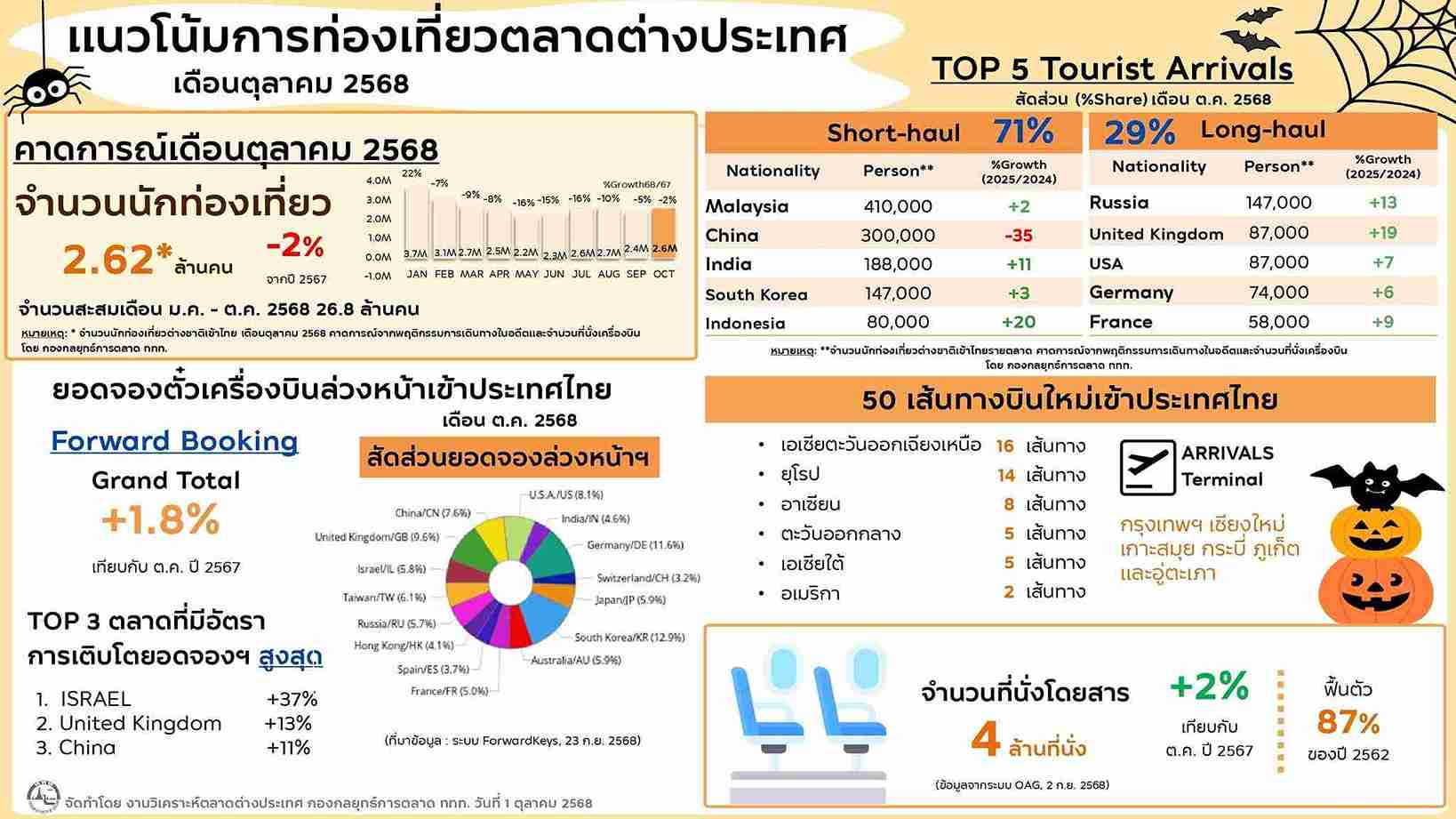 ด้านตลาดต่างชาติ รายงาน แนวโน้มเดือนตุลาคม 2568 คาดนักท่องเที่ยวต่างชาติราว 2.62 ล้านคน ลดลงเล็กน้อยจากปีก่อน แต่มี “แรงหนุนเฉพาะจังหวะ” ที่สำคัญ ได้แก่