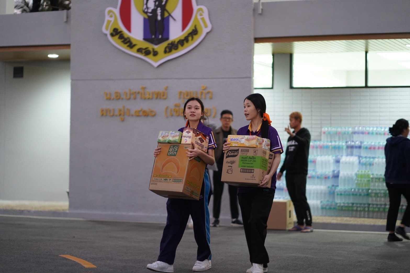 อาคารคลังบรรเทาสาธารณภัยของฝูงบิน 416 ในเย็นวันดังกล่าวแทบไม่เหลือพื้นที่ว่าง พื้นห้องและลานด้านนอกเต็มไปด้วยกล่องสิ่งของบริจาคที่เรียงซ้อนกันเป็นแถวสูง ทั้งข้าวสาร อาหารแห้ง น้ำดื่ม ผ้าอนามัย ผ้าอ้อมเด็กและผู้ใหญ่ ยารักษาโรคขั้นพื้นฐาน ของใช้จำเป็นในชีวิตประจำวัน ไปจนถึงอุปกรณ์ทำความสะอาดและสุขอนามัยหลังน้ำลด