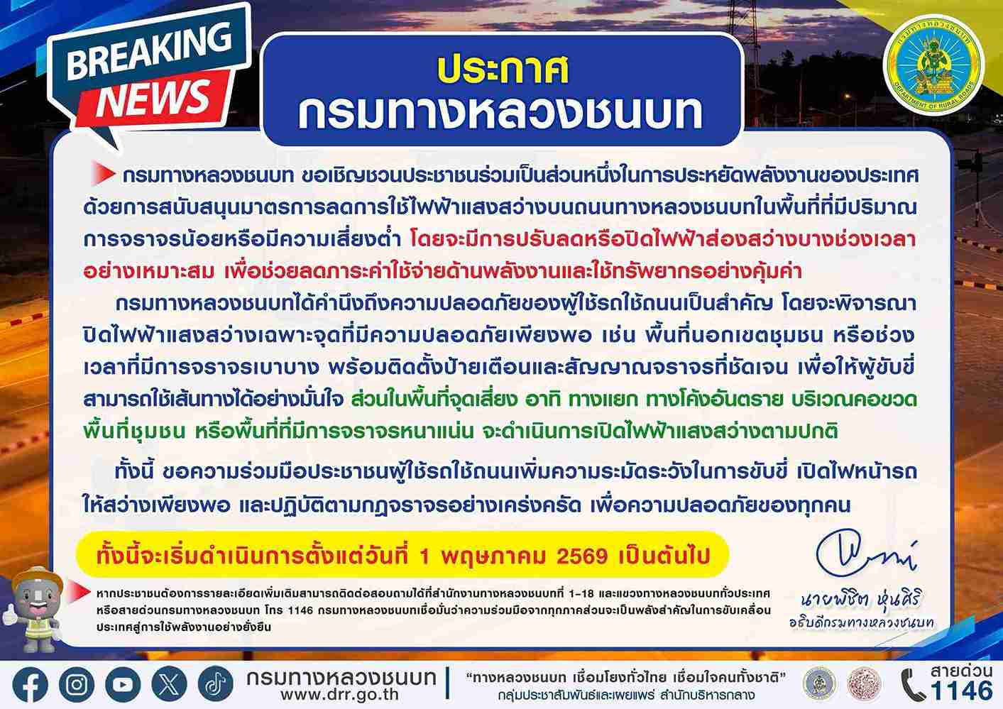 กรมทางหลวงชนบท ภายใต้การนำของนายพิชิต หุ่นศิริ อธิบดีกรมทางหลวงชนบท ออกประกาศอย่างเป็นทางการเชิญชวนประชาชนร่วมเป็นส่วนหนึ่งในการประหยัดพลังงานของประเทศ ด้วยการสนับสนุนมาตรการลดการใช้ไฟฟ้าแสงสว่างบนถนนทางหลวงชนบทในพื้นที่ที่มีปริมาณการจราจรน้อยหรือมีความเสี่ยงต่ำ โดยจะมีการปรับลดหรือปิดไฟฟ้าส่องสว่างบางช่วงเวลาอย่างเหมาะสม และมีผลบังคับใช้ตั้งแต่วันที่ 1 พฤษภาคม 2569 เป็นต้นไป