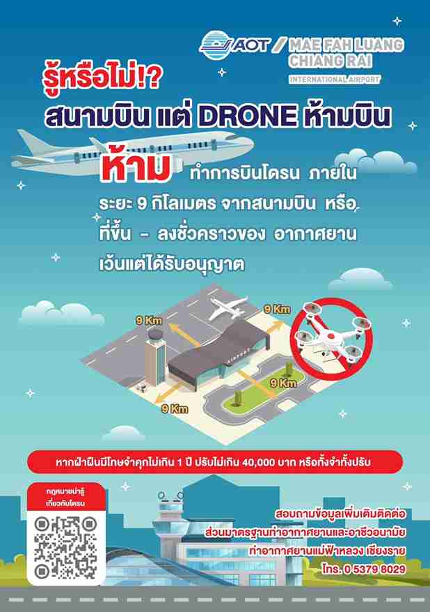 พิธีเปิดโครงการ “รณรงค์ส่งเสริมการป้องกันอันตรายจากโคมลอย โคมไฟ โคมควัน และการใช้งานโดรน ในเขตปลอดภัยในการเดินอากาศของท่าอากาศยานแม่ฟ้าหลวง เชียงราย ประจำปีงบประมาณ 2569” จัดขึ้นเมื่อวันที่ 20 ตุลาคม 2568 ณ โรงแรมไชยนารายณ์ริเวอร์ไซด์ โดยมี นาวาอากาศเอก สกรรจ์ อุดล ผู้เชี่ยวชาญ 9 และรักษาการผู้อำนวยการท่าอากาศยานแม่ฟ้าหลวง เชียงราย เป็นประธาน พร้อมผู้แทนจาก ฝูงบิน 416 เชียงราย, หอการค้าจังหวัดเชียงราย, สมาคมโรงแรมจังหวัดเชียงราย, ตำรวจภูธรเมืองเชียงราย, มณฑลทหารบกที่ 37, ประชาสัมพันธ์จังหวัดเชียงราย และคณะทำงานจากชุมชนรอบสนามบิน เข้าร่วมรับฟังและแลกเปลี่ยนข้อมูลอย่างคึกคัก