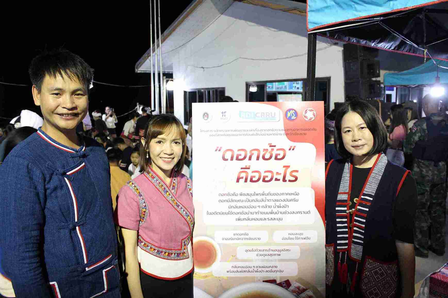 นางสนอง จันต๊ะคาด ประธานวิสาหกิจชุมชนอาหารท้องถิ่นไทลื้อบ้านหาดบ้าย เล่าถึงจุดเริ่มต้นของการเปลี่ยนแปลงครั้งสำคัญว่า “เริ่มแรกเกิดจากความคิดที่ว่า หากดอกซ้อสามารถนำมาทำขนมได้ ไฉนจึงไม่สามารถนำมาทำเป็นเครื่องดื่มได้บ้าง” ความพยายามในการนำมาแปรรูปเป็นชาเริ่มต้นด้วยการลองผิดลองถูกหลายปี ก่อนที่จะได้รับความร่วมมือครั้งสำคัญจากคณะวิทยาการจัดการและคณะสังคมศาสตร์ สาขาคหกรรมศาสตร์ มหาวิทยาลัยราชภัฏเชียงราย ภายใต้โครงการนวัตกรรมการพัฒนาและเล่าเรื่องชาดอกซ้อตามแนวทางอาหารปลอดภัย