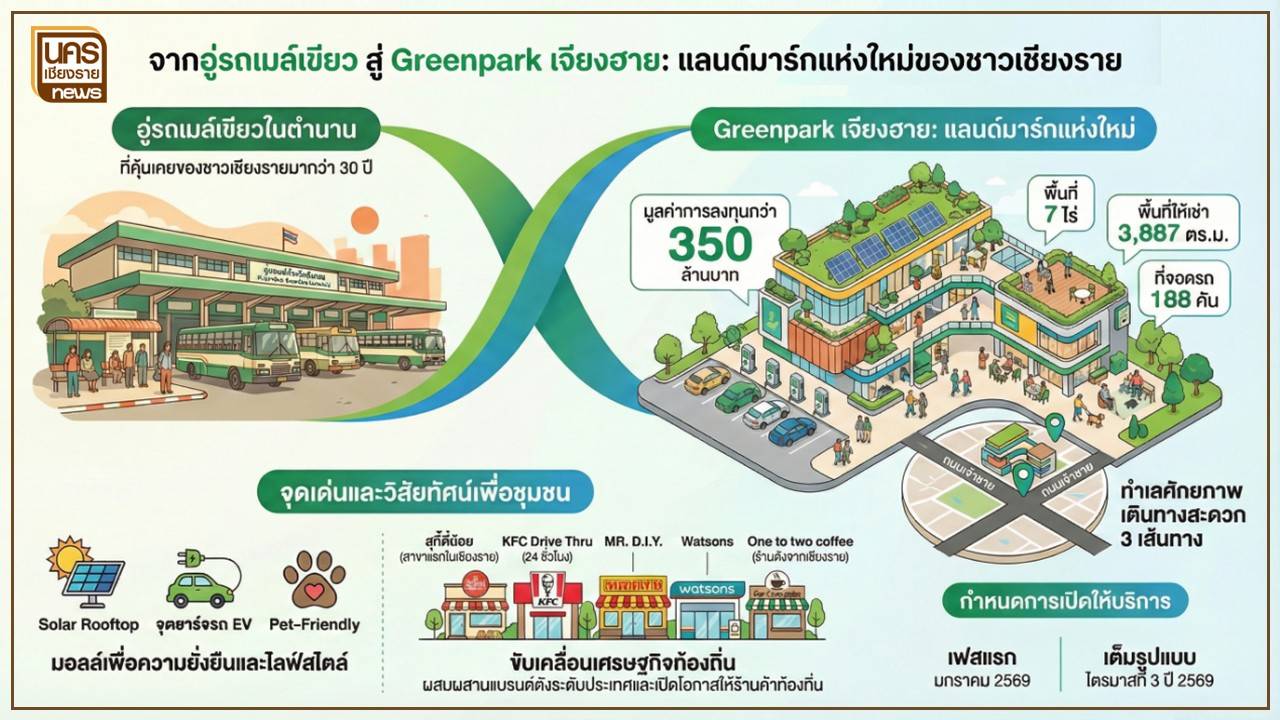 เชียงราย, 21 มกราคม 2569 — หากย้อนภาพจำของหัวมุมแยกประสพสุขในความทรงจำของคนเชียงราย หลายคนอาจนึกถึงความคึกคักของผู้โดยสารที่เดินทางเข้า ออกจังหวัด กล่องพัสดุที่ถูกลำเลียงข้ามอำเภอ หรือเสียงเรียกชื่อปลายทางจาก “รถเมล์เขียว” ที่อยู่คู่เมืองมากว่า 3 ทศวรรษ แต่ในวันนี้ พื้นที่เดิมที่เคยเป็นจุดรับ ส่งผู้โดยสารและพัสดุ ได้ถูกเขียนบทใหม่ด้วยโครงการ “กรีนพาร์คเจียงฮาย” (Greenpark Community Mall Chiang Rai) คอมมูนิตี้มอลล์ในเครือ Greenbus แห่งที่ 2 ที่ผู้พัฒนาโครงการประกาศชัดว่า “ไม่ได้ทำเพื่อเป็นเพียงพื้นที่ค้าปลีก” หากต้องการเป็น ฟันเฟืองการพัฒนาเมืองและชุมชนอย่างยั่งยืน