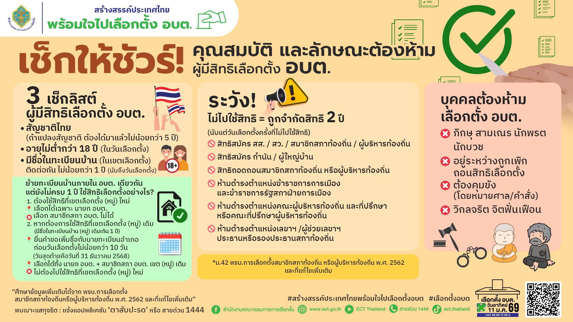 สำนักงานคณะกรรมการการเลือกตั้ง (กกต.) เดินหน้าปลุกพลังคนไทยเตรียมพร้อมเลือกตั้ง ส.อบต. และ นายก อบต. ในวันอาทิตย์ที่ 11 มกราคม 2569 ชูประเด็น “ทุกเสียงกำหนดอนาคตชุมชน” พร้อมแนะขั้นตอนตรวจสอบคุณสมบัติละเอียดยิบ โดยเฉพาะกรณีการย้ายทะเบียนบ้านที่อาจทำให้พลาดสิทธิเลือกผู้แทนหมู่บ้านโดยไม่รู้ตัว ย้ำหากไม่ไปใช้สิทธิอาจถูกจำกัดสิทธิทางการเมืองนานถึง 2 ปี