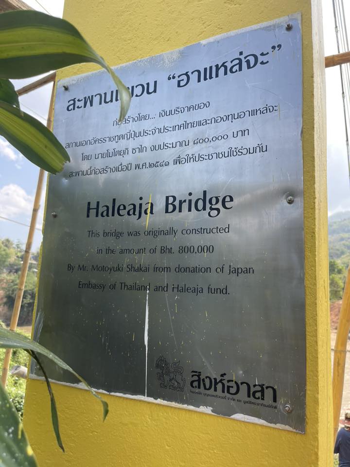 คำว่า ฮาแหล่จะ ถูกอธิบายไว้ในข้อมูลว่า หมายถึง ความสัมพันธ์ที่ดีเลิศ ซึ่งเป็นชื่อที่นายโมโตยุกิ ซาไกและชาวบ้านร่วมกันตั้งไว้ในวันเปิดใช้งานสะพานเมื่อกว่า 20 ปีก่อน ชื่อดังกล่าวสะท้อนบทบาทของสะพานได้อย่างชัดเจน เพราะมันไม่เพียงเชื่อมฝั่งแม่น้ำ แต่เชื่อมคน เชื่อมชาติพันธุ์ และเชื่อมวัฒนธรรมเข้าหากัน