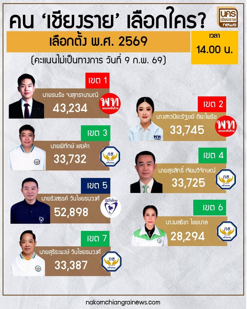 - สถิติผลคะแนนเลือกตั้งรายเขตจังหวัดเชียงราย 7 เขต ใช้จาก “ข้อมูลที่ผู้ใช้แนบในคำสั่งงาน” วันที่ 9 กุมภาพันธ์ 2569 โดยผู้เขียนยึดตามตัวเลขและรายชื่อที่ปรากฏในข้อมูลดังกล่าวเท่านั้น