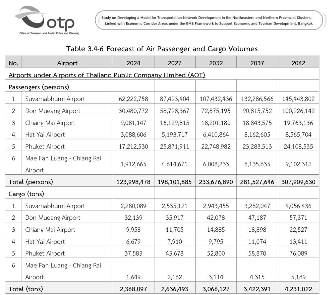 เมื่อหันกลับมาดูตารางพยากรณ์ในเอกสารประกอบที่แนบมา ซึ่งอ้างถึง Table 3.4-6 ของการศึกษาด้านเครือข่ายคมนาคมในกลุ่มจังหวัดภาคเหนือและภาคตะวันออกเฉียงเหนือภายใต้กรอบ GMS จะพบตัวเลขที่ชวนให้คิดต่ออย่างมาก สำหรับท่าอากาศยานแม่ฟ้าหลวง เชียงราย ปริมาณผู้โดยสารถูกคาดการณ์ไว้ที่ 1,912,665 คนในปี 2024 ก่อนจะเพิ่มเป็น 4,614,671 คนในปี 2027 ขยับเป็น 6,008,233 คนในปี 2032 และแตะ 9,102,312 คนในปี 2042 ส่วนปริมาณสินค้าเพิ่มจาก 1,649 ตันในปี 2024 เป็น 5,189 ตันในปี 2042 ข้อมูลชุดนี้ปรากฏอยู่ในรายงานการศึกษาของ สนข. ที่เผยแพร่เมื่อเดือนมีนาคม 2569 และยืนยันว่ามีการทำแบบจำลองพยากรณ์ปริมาณผู้โดยสารและสินค้าให้กับสนามบินในสังกัด AOT รวมท่าอากาศยานแม่ฟ้าหลวง เชียงรายด้วย