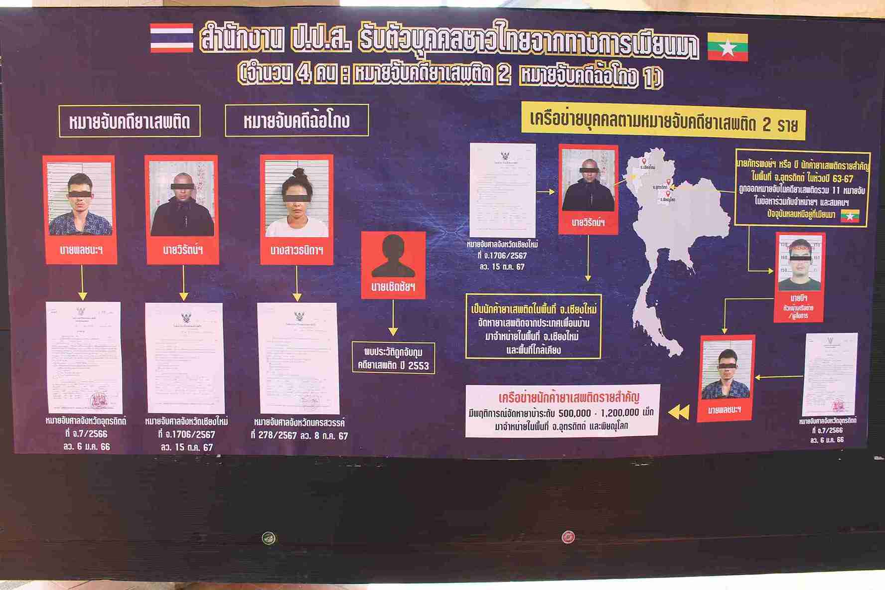 ผู้ต้องหาสัญชาติไทยที่ถูกส่งมอบในครั้งนี้มีทั้งหมด 4 คน โดยในจำนวนนี้เป็นผู้ต้องหาตามหมายจับคดียาเสพติด 2 ราย และผู้ต้องหาคดีฉ้อโกง 1 ราย รวมทั้งผู้หลบหนีเข้าเมืองอีก 1 ราย