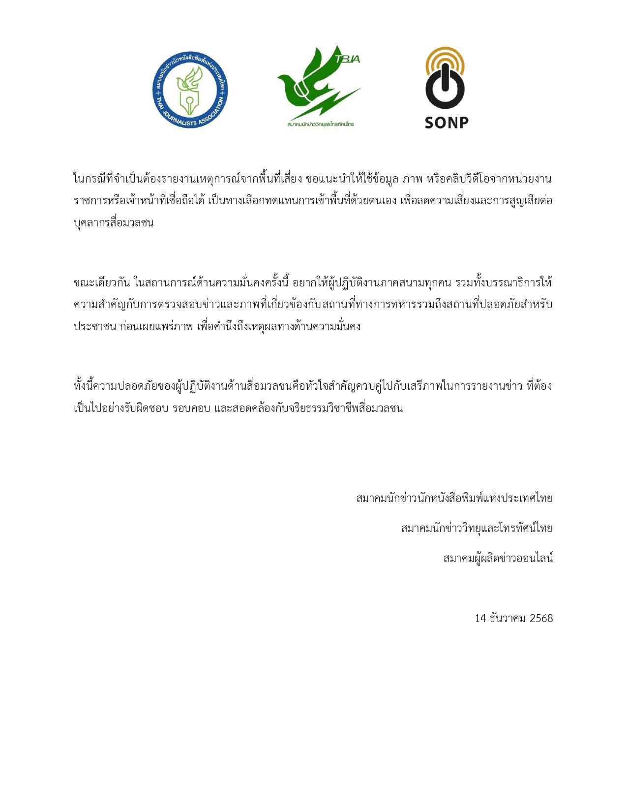 สมาคมนักข่าวนักหนังสือพิมพ์แห่งประเทศไทย สมาคมนักข่าววิทยุและโทรทัศน์ไทย และ สมาคมผู้ผลิตข่าวออนไลน์ แสดงความห่วงใยต่อความปลอดภัยของผู้สื่อข่าว ช่างภาพ และบุคลากรสื่อมวลชนทุกท่านที่ปฏิบัติหน้าที่รายงานข่าวสถานการณ์บริเวณชายแดนไทย–กัมพูชา พร้อมขอชื่นชมการทำหน้าที่อย่างเข้มแข็ง มุ่งมั่นนำเสนอข้อมูลข่าวสารที่เป็นประโยชน์ต่อสาธารณชนภายใต้สถานการณ์ที่มีความอ่อนไหวและ