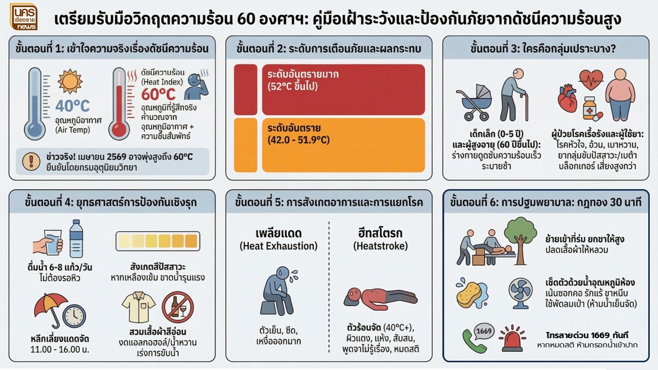 ในท้ายที่สุด ข่าวเรื่องดัชนีความร้อนอาจพุ่งสูงถึง 60 องศาเซลเซียส ไม่ได้เป็นเพียงประเด็นยืนยันถูกหรือผิดของข้อมูลออนไลน์ แต่เป็นสัญญาณเตือนว่าประเทศไทยกำลังเผชิญโจทย์ด้านสุขภาพจากอากาศร้อนที่ต้องรับมืออย่างจริงจังมากขึ้นทุกปี และเมื่อหน่วยงานรัฐออกมายืนยันแล้วว่าข่าวนี้เป็นเรื่องจริง สิ่งที่สำคัญกว่าความตกใจ คือการแปลงข้อมูลให้เป็นการป้องกันตัวที่จับต้องได้ในชีวิตประจำวัน ยิ่งในช่วงต้นเมษายนซึ่งเป็นรอยต่อก่อนเทศกาลเดินทางใหญ่ของประเทศ การเตรียมพร้อมของประชาชน ครอบครัว ชุมชน และหน่วยงานท้องถิ่น จะเป็นตัวแปรสำคัญว่าความร้อนที่รุนแรงขึ้นจะจบลงแค่ความไม่สบายตัว หรือจะลุกลามไปสู่ภาระทางสุขภาพที่หนักหนากว่านั้น