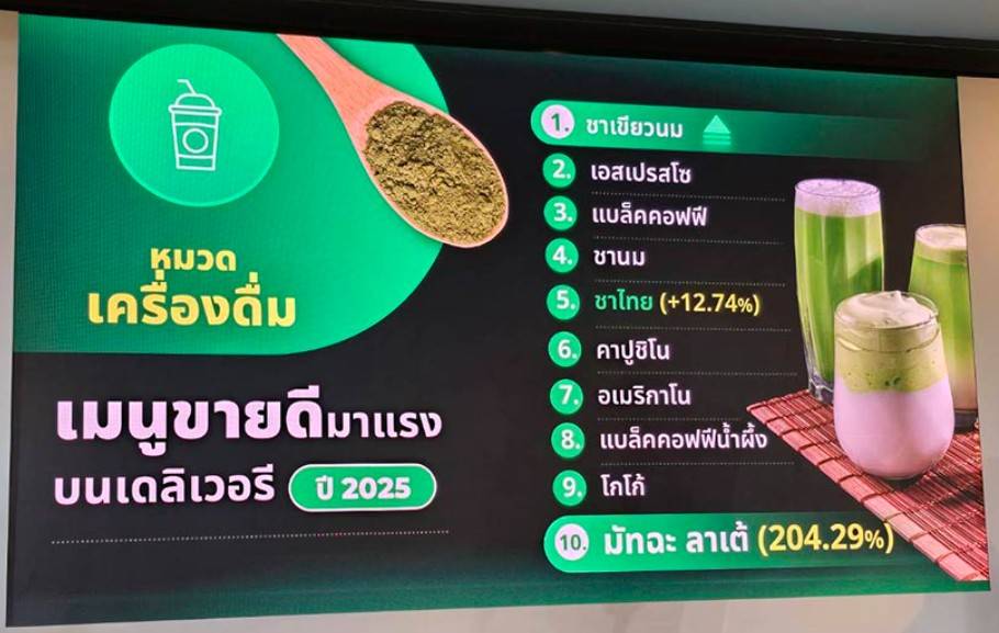 ท่ามกลางความหนืดของตลาดอาหาร หมวดเครื่องดื่ม กลับงอกเงย โดยเฉพาะร้านกาแฟและชาเขียวที่พุ่งสวนทางกับร้านอาหารภาพรวม คีย์เวิร์ดของปีนี้คือ “มัทฉะ” ซึ่ง ยอดขายเครื่องดื่มชาเขียวเติบโต 28% มูลค่ารวมแตะราว 1,160 ล้านบาท จำนวนร้านที่ขายเมนูชาเขียวเพิ่มจาก 9,600 เป็น 12,400 ร้าน และบนแพลตฟอร์มเดลิเวอรีมีการสั่ง “มัทฉะ” มากกว่า 5 ล้านแก้ว ในครึ่งปีแรกเพียงอย่างเดียว